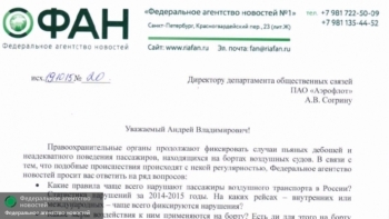 Федеральное агентство новостей обратилось с официальным запросом, в котором попросило авиакомпании «Аэрофлот» и «Россия» предоставить данные о случаях авиадебошей, имевших место в нынешнем году.