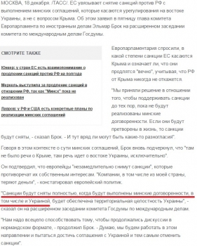 Понимаем, что глава комитета Европарламента по иностранным делам Эльмар Брок, в том числе, хотел заявить и нечто вроде: «Мы давим и на Украину». Но санкции введены не против Украины, они введены против России. А для Украины запущен механизм отмены туристических виз в ЕС (посмотрим, доведут ли его до конца). Смысл отмены туристических виз только в одном – легитимация киевского режима, т.е. продление его власти на Украине.