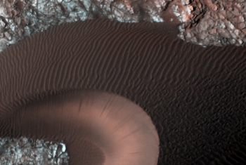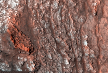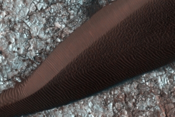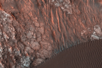 Изображение получено с борта станции Mars Reconnaissance Orbiter (MRO), которая была запущена примерно десять лет назад. Этот аппарат предназначен для анализа рельефа, стратиграфии, минералов и льда на Красной планете.