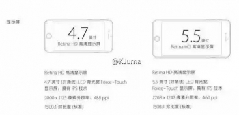 Твиттер @KJuma сообщает, что более компактный смартфон (iPhone 6S) фигурирует с разрешением 2000х1125 пикселей, что дает плотность пикселей 488 ppi, а фаблет (iPhone 6S Plus) – 2208х1242 пикселей (или 460 ppi). Оба экрана будут поддерживать технологию Force Touch, которая определяет силу нажатияпо экрану, а уровень контрастности в обоих десплеях составит 1500:1. Напомним, что официальный анонс iPhone 6S и 6S Plus состоится уже в эту среду. Вот как выглядит общая картина смартфонов на сегодняшний день: 4,7- и 5,5-дюймовые дисплеи на iPhone 6S и 6S Plus соответственно, чипсет А9, 2 Гб оперативной памяти, 16/64/128 Гб постоянной памяти, 12- и 5-мегапиксельные камеры спереди корпуса и сзади, аккумулятор на 1715 мАч у iPhone 6S и 2750 мАч у iPhone 6S Plus, укрепленный алюминий 7000-серии и операционная система iOS 9.