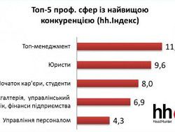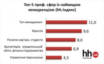 Согласно данным экспертов, наибольшая конкуренция на Украине наблюдается за должности ТОП-менеджеров. Чуть меньшая борьба идёт за должности юриста, финансиста, а также менеджера по персоналу.