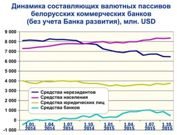 Данные пассивы имеют несколько составляющих. Самая крупная статья – это средства физических лиц. Несмотря на падение доходов, население продолжает копить валюту, размещая ее на депозитах в банках. Так, за десять месяцев текущего года сумма таких депозитов выросла на 359,2 млн долларов и достигла 8,4 млрд. Темпы роста не очень велики, в прежние годы они были намного выше, так как сейчас некоторые люди опасаются, что из-за дефицита валюты власти, чего доброго, решат заморозить валютные депозиты, а то и конвертировать их в рублевые. Нестабильность в соседних странах, а также нестабильность на валютном рынке самой Беларуси постоянно подогревают такие подозрения.
