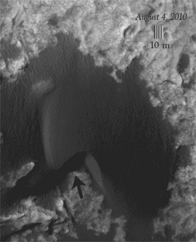 На анимации показаны изменения, происходящие с дюнами в период с 2010 по 2014 год. Видео смонтировано при помощи снимков, полученных научным инструментом HiRISE (High Resolution Imaging Science Experiment) спутника MRO (Mars Reconnaissance Orbiter)