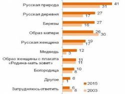 Почти равное количество жителей России — по 26−27% — продолжили список образов страны такими определениями, как русская деревня, березы и образ матери. Отметим, что образы деревни и берез усилились с 16−17% в 2003 году. А вот образ матери немного потускнел — доля ответов сократилась на 4%.