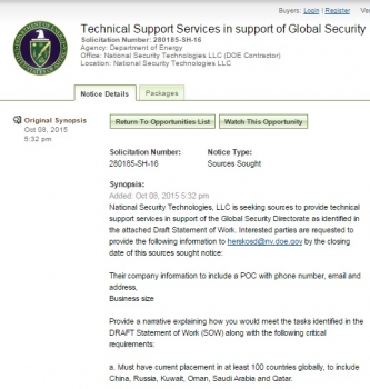 Подрядчик Министерства энергетики с говорящим названием National Security Technologies LLC закупает услуги технической поддержки для осуществления проекта управлением глобальной безопасностью.