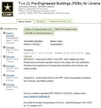 Поскольку Украина (закономерно) отнесена к зоне ответственности Армии США в Европе, головной офис в Кайзерслаутерн проводит закупку двух разборно-сборных здания (конкретные характеристики в закрытой части закупки).