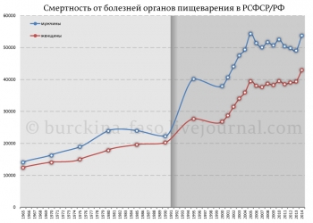 Вчера я выложил данные смертности россиян за последние 50 лет. Критики не заметили фактической стороны дела, а именно огромного роста смертности после 1991 года. Поэтому я акцентирую внимание на отдельном графике, связанном с желудком человека. Может через желудок достучусь до разума. Итак, смертность от болезней органов пищеварения в РСФСР/РФ: