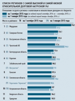 Рекордсменом по госдолгу НРА называет Мордовию, где долговая нагрузка по итогам трех кварталов 2015 года выросла со 121,2 % до 176,2 %, что на 1 октября 2015 года стало рекордно высоким значением среди всех субъектов РФ. В Хакасии показатель увеличился с 85,7 % до 107,6 %, в Забайкальском крае — с 87,9 % до 108,2 %, приводит данные исследования «Известия».