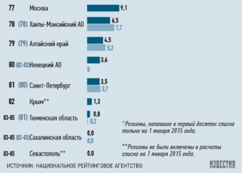 В 12 регионах страны объем госдолга превышает установленную Бюджетным кодексом предельную отметку в 100 % от собственных бюджетных доходов, при этом не имеют госдолга лишь два региона из 85 — Сахалинская область и Севастополь. Таковы выводы исследования Национального рейтингового агентства (НРА).
