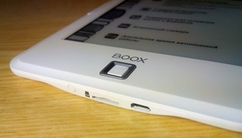 С лицевой панелью разобрались, переходим дальше. Сзади и по бокам корпуса ридера нет ровным счетом ничего во избежание случайного нажатия во время использования. Верхний торец содержит в себе две кнопки – включения и перезагрузки, и если первая имеет рифленую форму и синюю подсветку, чтобы ее всегда можно было найти на ощупь, то вторая утоплена глубоко в корпус. Сомневаемся, что Reset здесь вам вообще когда-либо потребуется, так как ридер работает на базе ОС Android, известной своей стабильностью и в данном случае не перегруженной программным обеспечением.