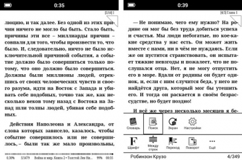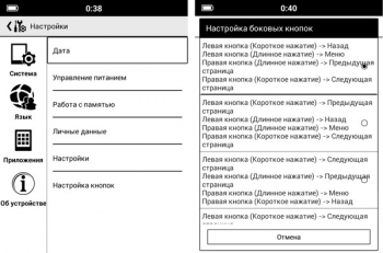 Ход кнопок достаточно тугой, что исключает случайные нажатия, но в то же время плавный, все как полагается. Базовые настройки кнопок такие: та, что слева от экрана, открывает различные меню в зависимости от длительности нажатия, а расположенная слева от экрана листает книгу вперед (короткое нажатие) и назад (удерживание). Изменить эти параметры всегда можно в меню.