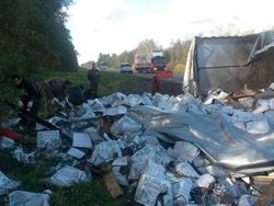 Инцидент произошел на 257-м километре трассы М-10. Водитель фуры не справился с управлением, в результате чего транспортное средство опрокинулось, а коробки со алкоголем оказались на обочине.
