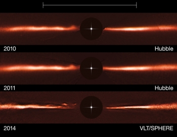 Европейская Южная обсерватория (ESO) сообщила об обнаружении в пылевом диске вокруг одной из близких к нам звёзд необычных быстродвижущихся волнообразных структур — такие образования не только никогда раньше не наблюдались, но даже не предсказывались.