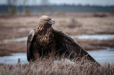 Это, пожалуй, и все, что я знал о беркуте. И, конечно, не доводилось видеть вживую дикого беркута с близкого расстояния. В конце марта я гулял по знакомому верховому болоту. Коротал время до открытия сезона охоты и наслаждался ранней весной. Весело заводили свои песни жаворонки и перелетали, делая головокружительные кульбиты, с места на место чибисы. Изредка в небе проходили стаи и одиночные лебеди. Внезапно в 60-70 метрах от меня вышла из-под низких сосен большая хищная птица, сделала несколько спокойных шагов, обернулась на меня и встала на крыло.