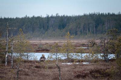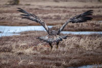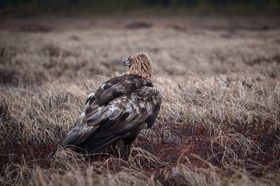 Накинув лямки рюкзака на плечи и ремень камеры на шею, я пошел дальше. Пройдя несколько десятков метров, боковым зрением замечаю движение совсем рядом в плотном сосняке. Это же снова он! Озираясь на меня, беркут спокойно выходит на свободный от сосен участок и взлетает. Теперь беркут, отлетев полторы сотни метров, усаживается на кочку на открытом болоте. Поведение птицы и ее внешний вид создали впечатление вполне бодрой и здоровой птицы. Но почему она так близко меня подпускает?