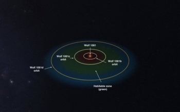 Исследователи из Университета Нового Южного Уэльса под руководством Дункана Райта (Dr Duncan Wright) описали систему из трех планет, вращающихся вокруг звезды Wolf 1061. Эта звезда — угасающий красный карлик в созвездии Змееносца. Она меньше и прохладнее Солнца. Расстояние от Земли до Wolf 1061 — «всего» 14 световых лет (совсем немного по космическим меркам).