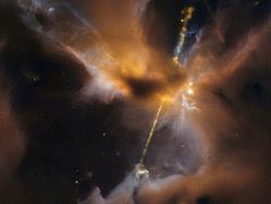 Один из объектов Хербига-Аро (HH24) и заснял «Хаббл» около молодой звезды, расположенной в созвездии Ориона, на расстоянии 1350 световых лет от Земли. Изображение было получено в инфракрасном диапазоне, что позволило телескопу проникнуть сквозь плотную газопылевую завесу, закрывающую молодую звезду.